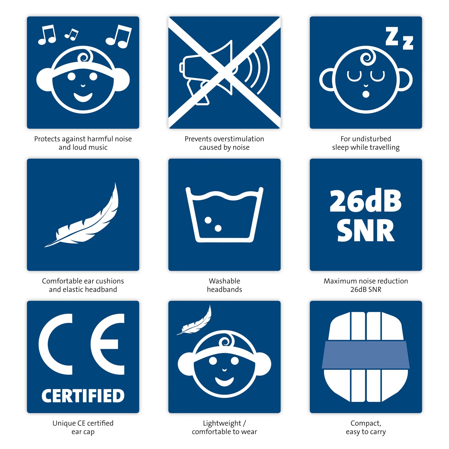 - De handige pasvorm in combinatie met de hoofdbandjes die standaard in twee maten worden meegeleverd maken de geluidsbescherming geschikt voor kindjes vanaf 12 maanden.