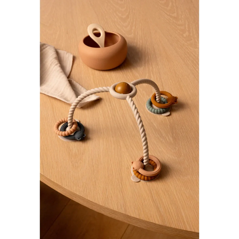 Eenheid prijs / PerMet de zuignappen om de soren aan de tafel te bevestigen, houdt dit sensorische speelgoed je kindje bezig. Laat je kindje de verschillende texturen en vormen ontdekken en beweeg de siliconen ringen op en neer om het middelste gedeelte een ratelend geluid te laten maken. De poten en ringen zijn gemaakt van zachte siliconen.
