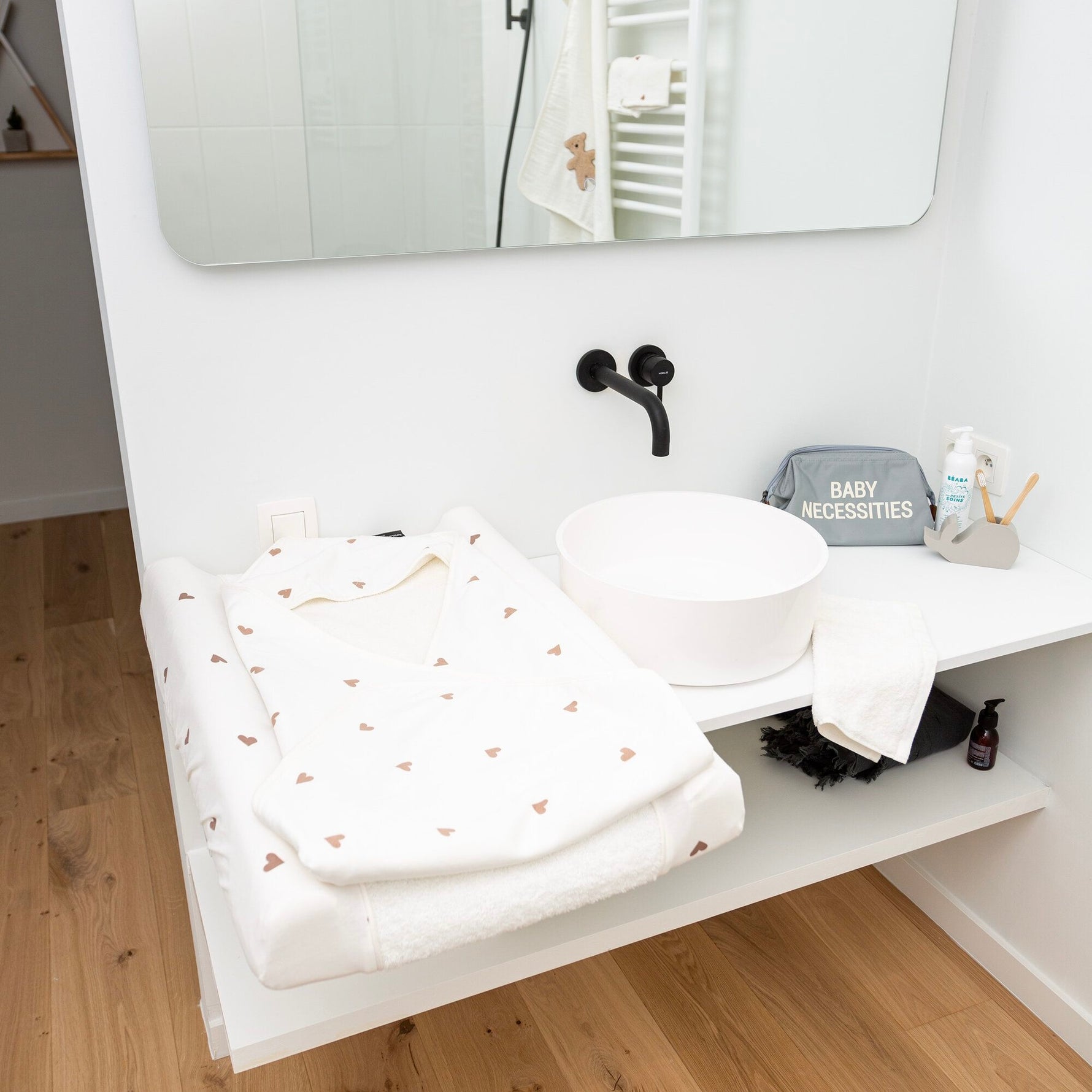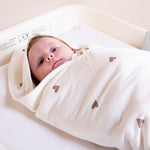 Superzachte baby badcape Jersey Hearts met bijpassend washandje. Beide zijn vervaardigd uit een extra dikke, zeer absorberende en ultra zachte badstof. De badcape is ideaal om jouw baby na zijn of haar badje snel te drogen zodat jouw baby geen kou krijgt. De badkap voor baby's heeft een prachtige print met kleine hartjes. De binnenzijde van de baby badjas en het washandje zijn gemaakt uit ultrazacht en absorberend terry-katoen.
