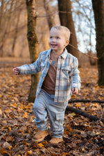 Dit flanellen overhemd is precies wat je zoekt voor je kleintje! Met een klassieke ruitprint in stijlvol Stone Blue heeft je kleintje een outfit die perfect is voor zowel gezellige winterdagen thuis als avonturen buitenshuis. Het zachte, warme flanel is gemaakt van biologisch katoen en Oekotex-gecertificeerd, dus je kunt met een gerust hart toekijken hoe hij de wereld ontdekt. De houtlook knopen geven hem net dat beetje extra. En die borstzakken? Perfect om zijn kleine schatten in op te bergen.
