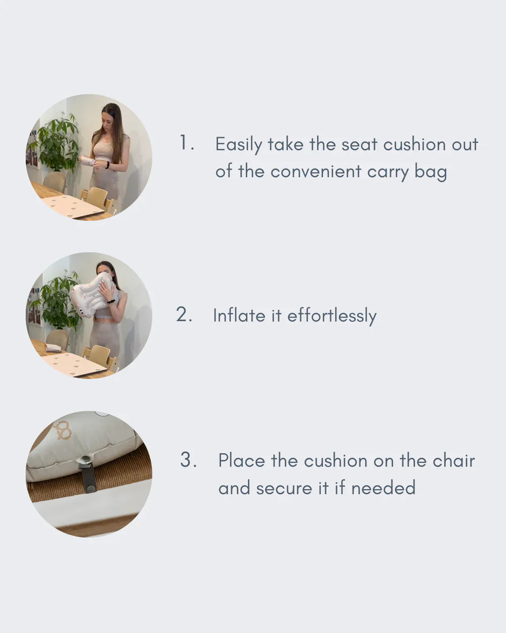 Het zitkussen is licht en compact, en wordt geleverd met een handige reistas. Je neemt het dus makkelijk overal mee naartoe, of je nu uit eten gaat of op bezoek bent. Er is geen pomp nodig, want het kussen is snel en eenvoudig met de mond op te blazen.