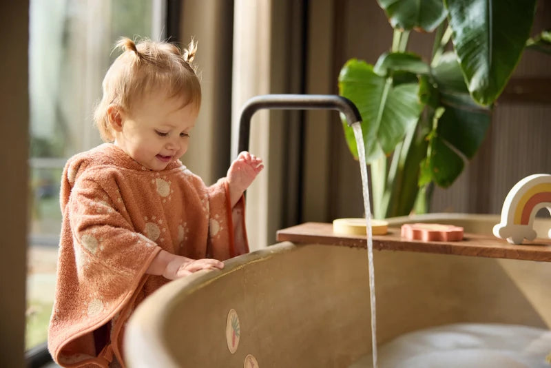Deze badponcho is perfect na een bad of een dag vol waterpret! De poncho is gemaakt van zachte badstof, wat het vocht snel opneemt. Het schattige capuchonnetje houdt het hoofdje lekker warm en door de omgekeerde kleuren van binnen- en buitenkant krijgt de poncho een speels tintje. Het drukknoopje aan de zijkant zorgt dat hij goed blijft zitten, ook als je kindje rondloopt of speelt. Ideaal voor thuis, maar ook handig mee te nemen naar het strand of zwembad!