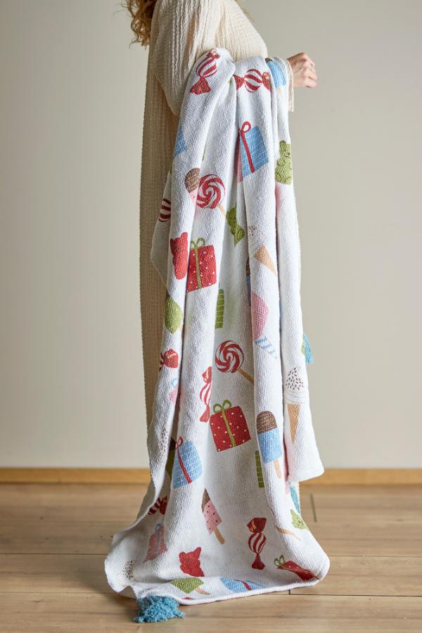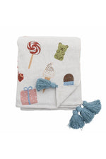 De Snoepjesplaid van Bloomingville MINI is een feestelijke toevoeging aan de kinderkamer. Gemaakt van gerecycled katoen, is de plaid versierd met charmante illustraties van cadeautjes, snoep en ijs – de droom van elk kind. Decoratieve kwastjes in elke hoek geven een extra vleugje charme. Gebruik hem om je kleintje warm te houden of als een gezellig, feestelijk detail in de kinderkamer.