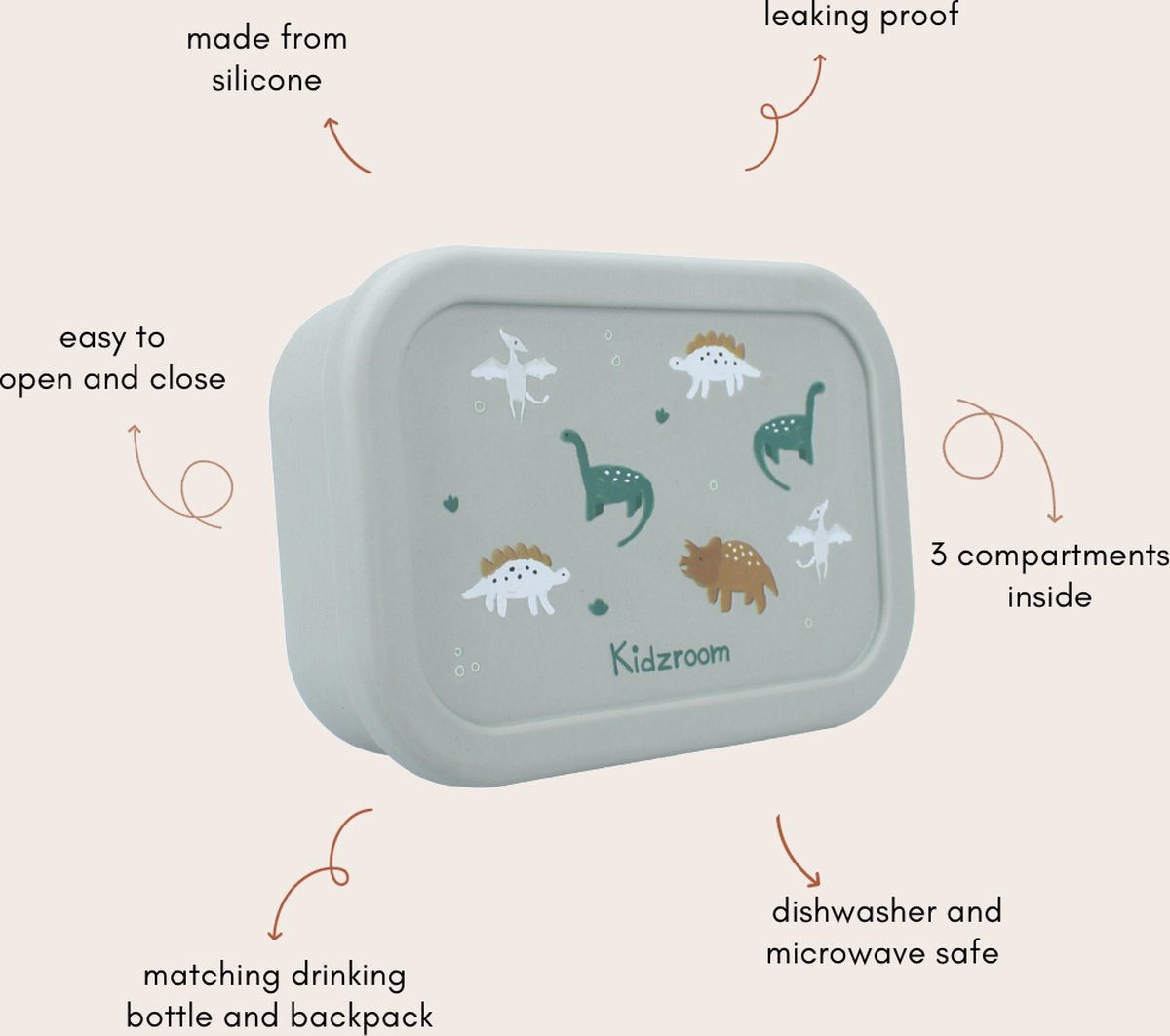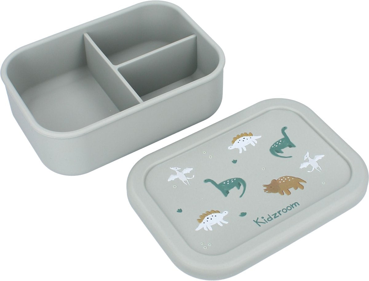 Deze prachtige lunchbox van Kidzroom uit de 'Small Talk' collectie is een echte must-have voor kinderen. De lunchbox heeft een stijlvolle groene kleur en is versierd met dino's. Dankzij het zachte siliconenmateriaal is de lunchbox eenvoudig te openen en te sluiten, perfect voor kleine kindjes. De binnenkant is slim ingedeeld in drie compartimenten, zodat je alle onderdelen van de lunch netjes en vers kunt houden. Door het silicone materiaal kan hij in de magnetron en in de vaatwasser. Praktisch én schattig! Voeg deze betoverende lunchbox van Kidzroom vandaag nog toe aan je assortiment.Bekijk en shop ook de bijpassen drinkbeker en rugzak van de ‘Small Talk’ collectie om de set compleet te maken. Bekijk en shop ook de bijpassen drinkbeker en rugzak van de ‘Small Talk’ collectie om de set compleet te maken.